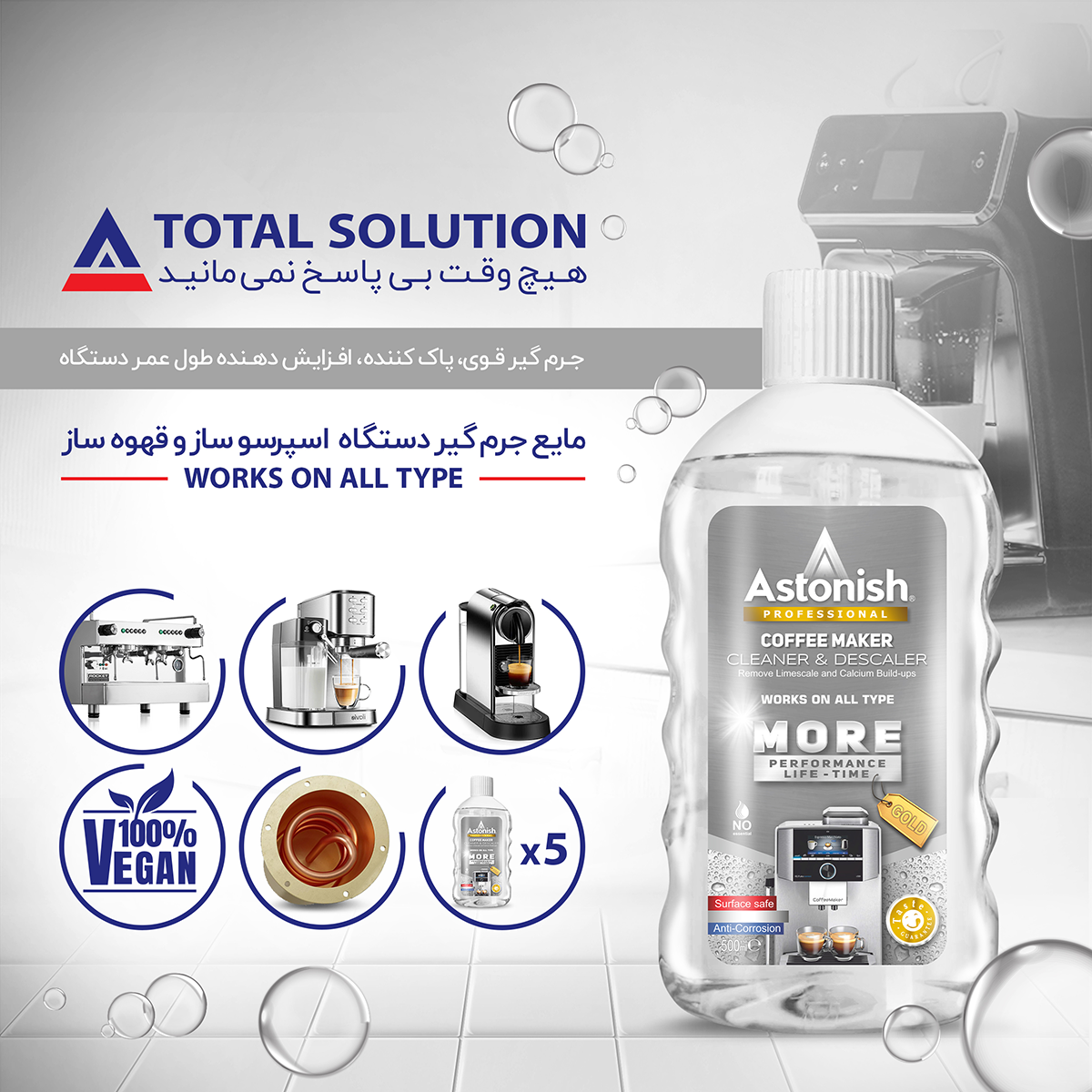 • جرم گیر اسپرسوساز آستونیش (Astonish) یک محلول کنسانتره و تخصصی با حجم 500 میلی‌لیتر است که برای افزایش طول عمر، سرعت و کارایی انواع دستگاه‌های قهوه‌ساز خانگی و صنعتی طراحی شده است. این جرم گیر قدرتمند به طور مؤثری رسوبات آهکی و کلسترول قهوه را از سیستم‌های حساس دستگاه مانند گرم‌کن، بخار و اسپری تجزیه و حذف می‌کند. یکی از مزایای کلیدی این محصول استونیش، تضمین بهبود طعم نهایی قهوه است، زیرا پس از جرم‌گیری، هیچ‌گونه بو، طعم یا پسماند غیر محلول از خود باقی نمی‌گذارد. فرمولاسیون ایمن آن دارای تأییدیه محافظت از لعاب سطوح و ضد خورندگی است تا به دستگاه شما آسیب نرساند و عملکرد آن را بهینه سازد.